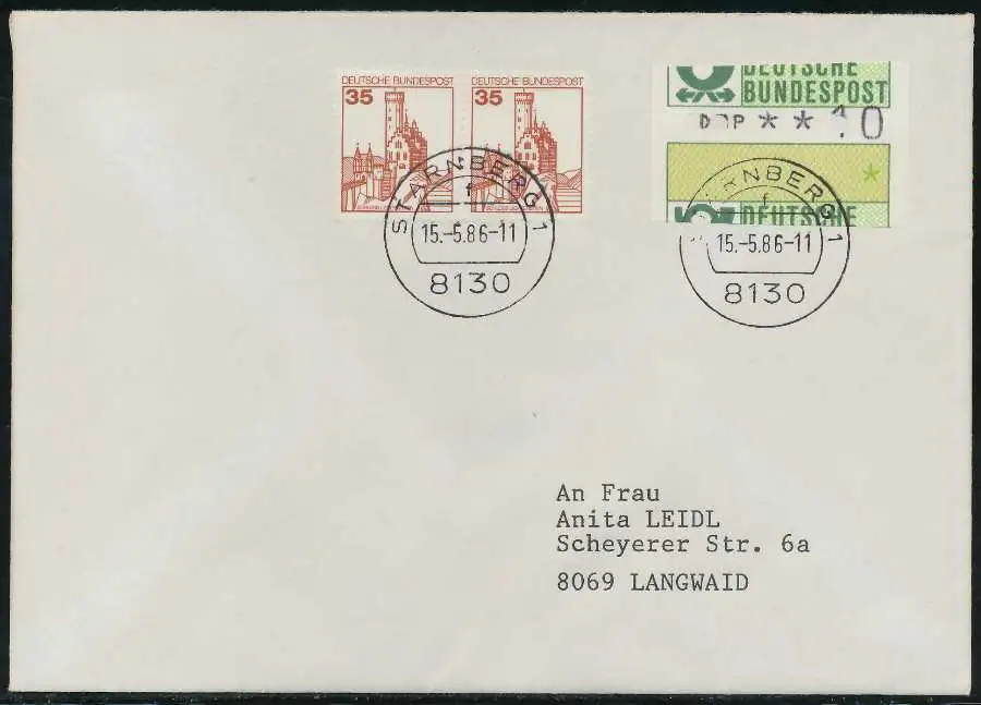 Normalbrief mit ATM1-010, sogenannter "Starnberger Reiter bzw. Starnberger Springer", beiliegend Quittung des Automaten mit Datum 15.05.1986, zusätzlich 35 Pfg waagerechtes Paar aus der Serie Burgen und Schlösser.