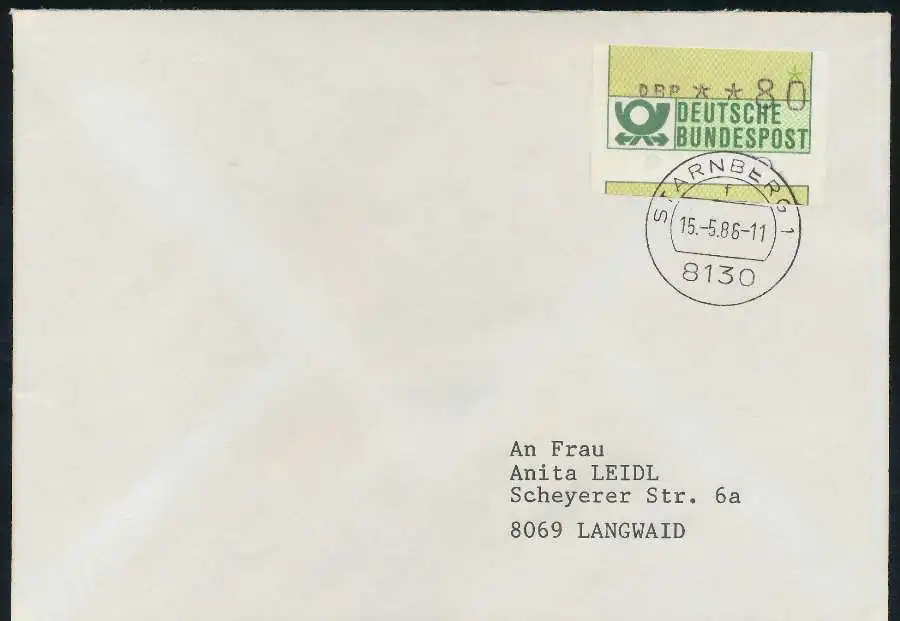 Normalbrief mit ATM1-080, sogenannter "Starnberger Reiter bzw. Starnberger Springer", beiliegend die Quittung des Automaten mit Datum 15.05.1986