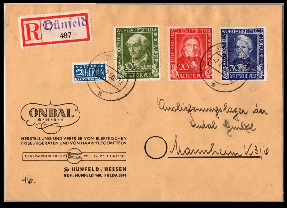 10,20,30 Pfennig Wohlfahrt als Mischfrankatur am 7.2.1950 portogerecht auf Einschreiben Fernbrief von Hünfeld nach Mannheim gelaufen.