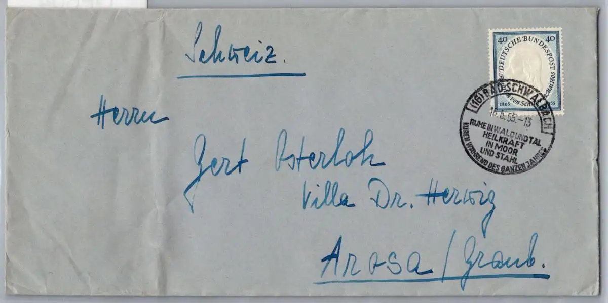 40 Pfennig Schiller als Einzelfrankatur auf Auslandsbrief am 16.5.1955 von Bad Schwalbach nach Arosa Schweiz gelaufen.