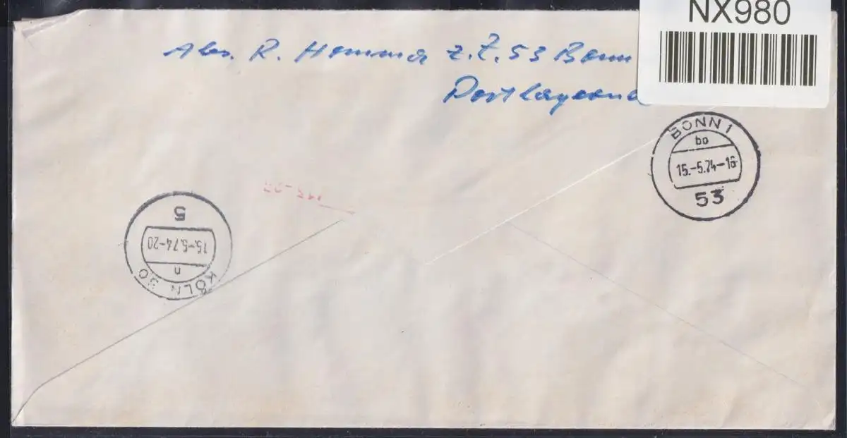 40 Pfennig 25 Jahre Bundesrepublik als Einzelmarken und Block am 15.5.1974 vom Ersttag durch Eilboten Express portogerecht von Bonn nach Köln gelaufen.