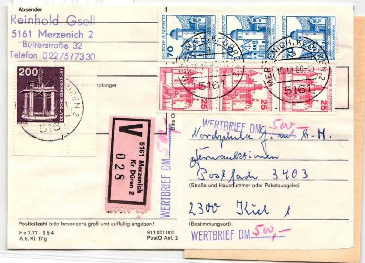 200 Pfenning (Fornummer 1) "Industrie und Technik" in Kombination mit 3x 25 Pfenning und 3x 70 Pfenning (je senkrechter 3er Streifen) "Burgen & Schlösser" als Mischfrankatur auf Wertbrief.