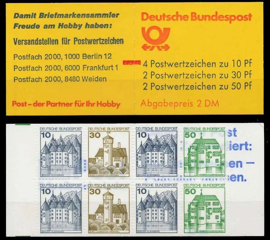 Markenheftchen Nr. 22II am K1, Letterset, weisse Gummierung, Burgen und Schlösser 10 + 30 + 10 + 50, Abstand zwischen Posthorn und unterster Zeile auf Deckelseite 3 beträgt 21mm