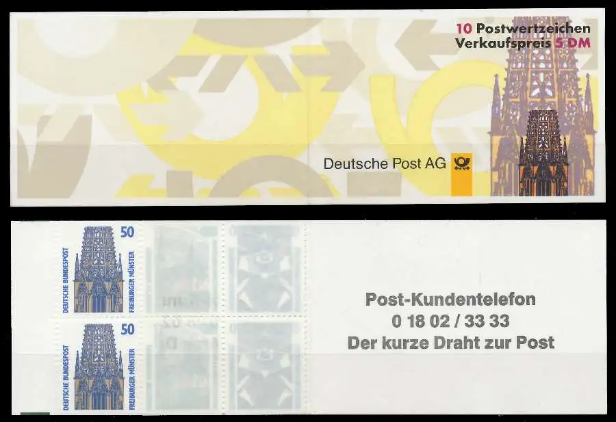 Markenheftchen Nr. 34 Sehenswürdigkeiten 50 + 80 + 10 + 10 + 100, Deckel mit Motiv Freiburger Münster