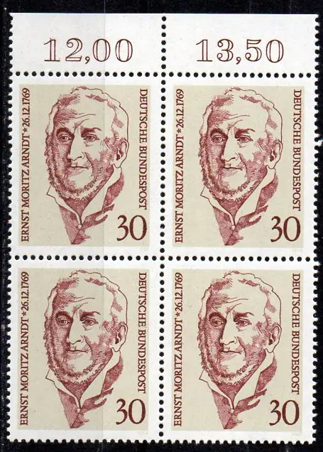 BRD, Mi-Nr. 611 **, 4´er-Block, Rand oben, Ernst Moritz Arndt