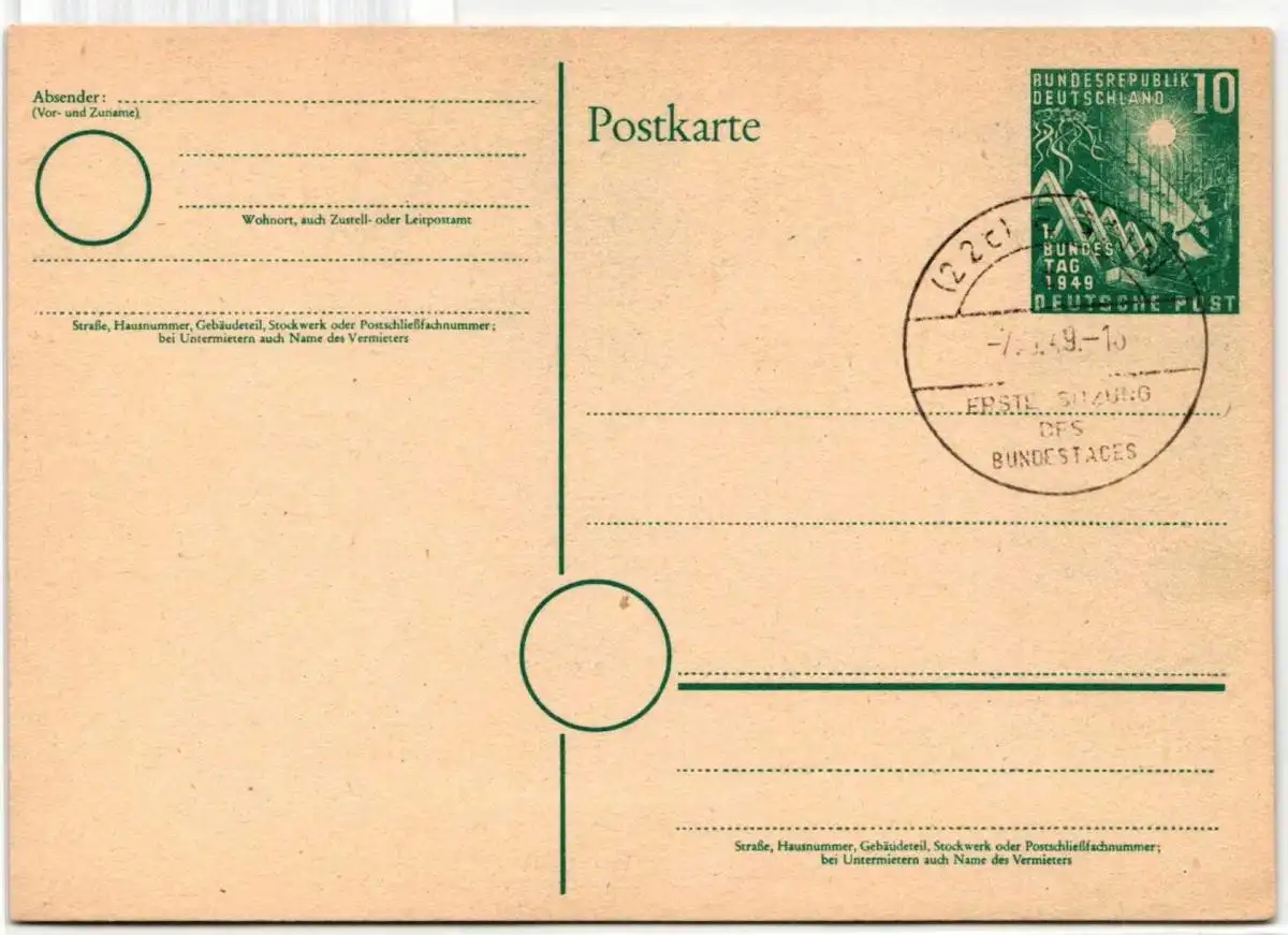 10 Pfennig Bundestag1949 mit Ersttagsonderstempel auf Ganzsache Pso 1 ungelaufen am 7.9.1949 gestempelt.