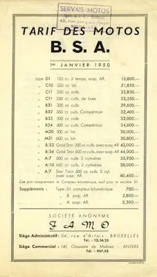 BSA belgische Preisliste 1950