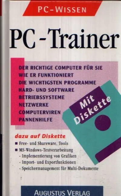 PC- Trainer; Bach, Alexander; Backer, Reiner; Schultes, Hartmut; Informatik; PC; Hardware;Prozessor; Hauptspeicher; Speicher-ABC; Systembus; Diskette; Festplatte; CD-ROM- Laufwerke; Monitor; Grafikkarte; Tastatur; Maus; Ein-Ausgabe-Schnittstelle; Drucker; Scanner; PC aufstellen und loslegen; Verbindungen schaffen; MS-DOS installieren; Sicherungskopien; Was alles schief gehen kann; Betriebssystem; Einführung in MS-DOS; Einführung in MS-WINDOWS 3.11; Einführung in WINDOWS 95; Netzwerke; Datenfernübertragung; Computerviren; BIOS SETUP; Wo kauft man Software; Pannenhilfe