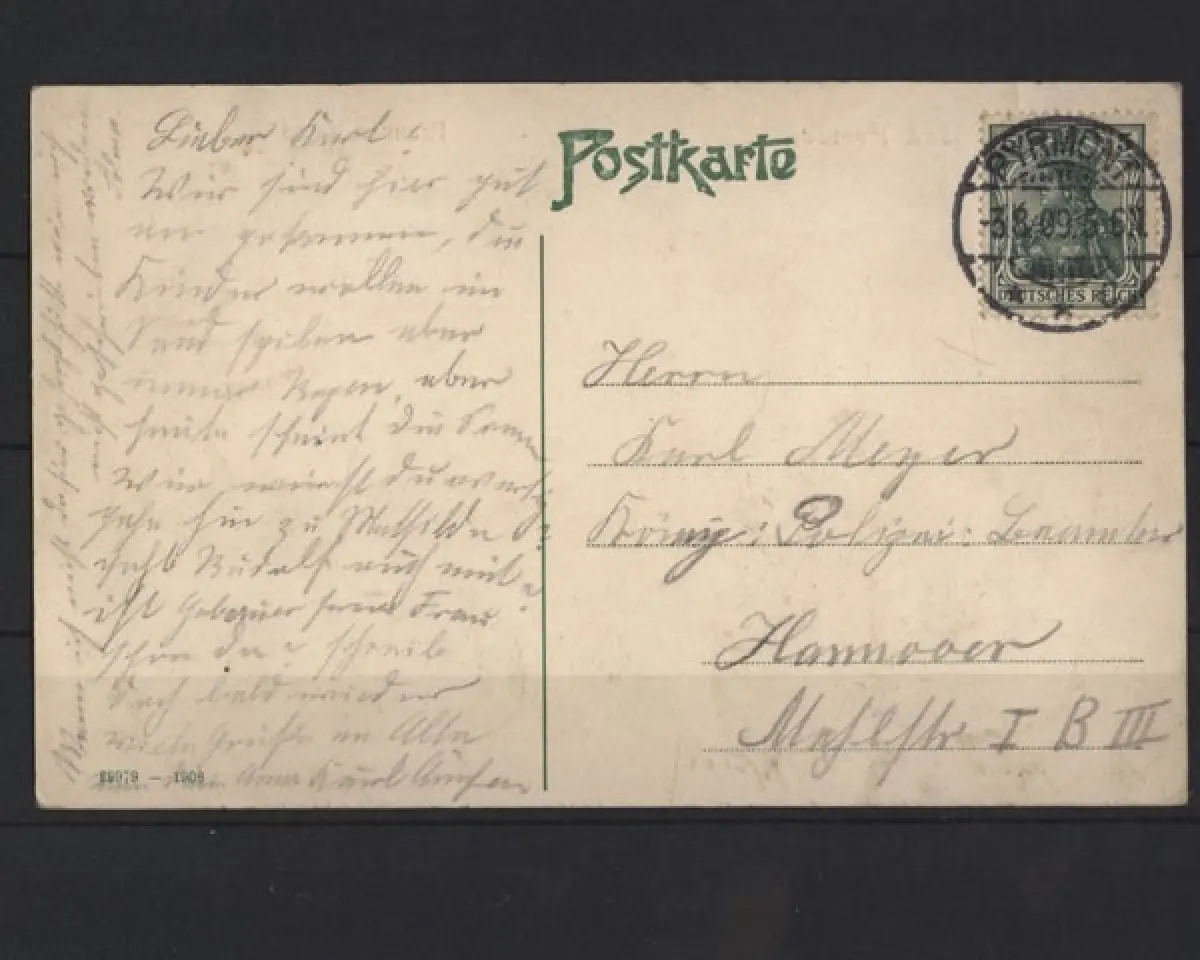 Karte 1909 gelaufen, Ecken leicht bestoßen, gute Erhaltung PLZ 31---