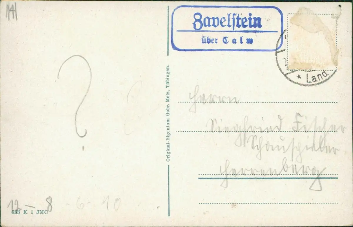 rückseitig mit Landpoststempel "Zavelstein über Calw"