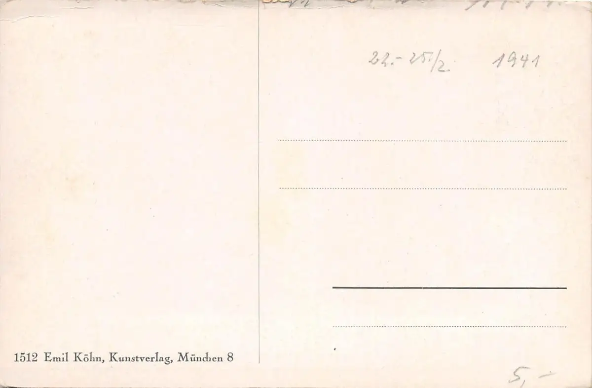Karte beschnitten, Ecken leicht abgestoßen, schmale Knicke entlang Rand oben, Rückseite auf 1941 datiert,