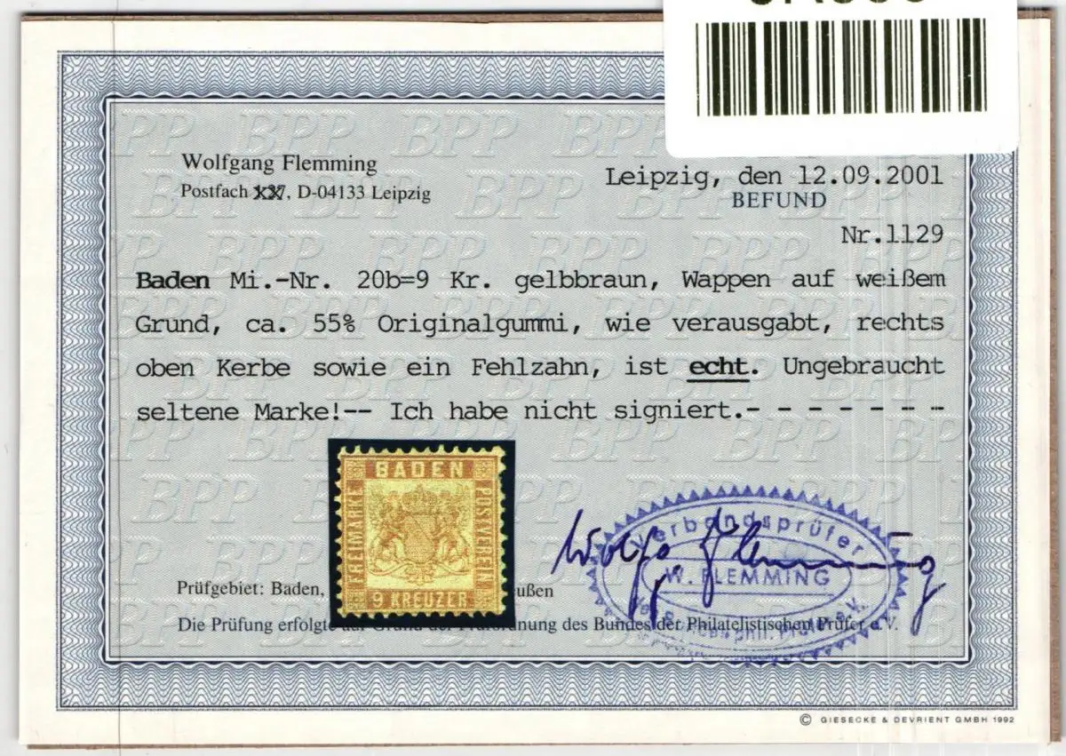 Baden 20 b mit Falz Befund Flemming BPP #JR550