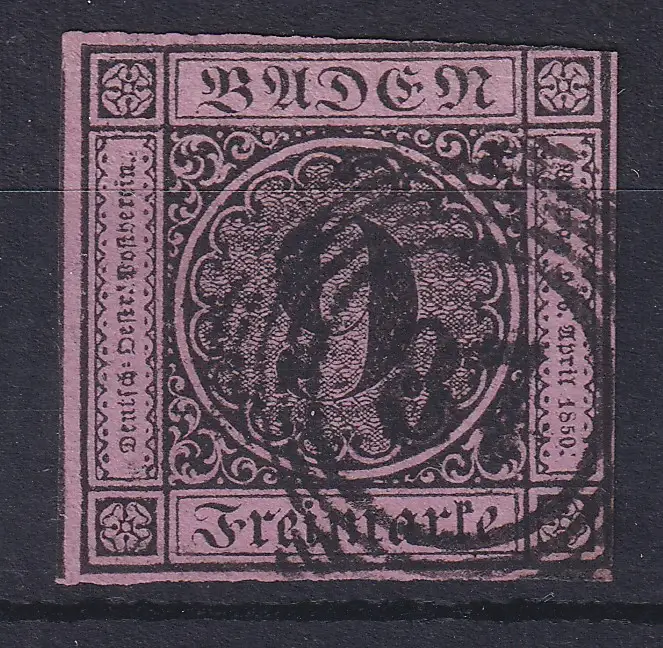 Baden 9 Kreuzer lila Mi.-Nr. 4b klar gestempelt 87 , nur oben rechts berührt