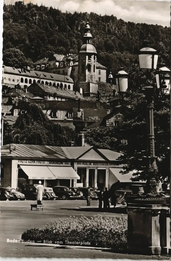 Baden-Baden Partie am Theaterplatz mit Photo-Geschäft, alte Autos 1959