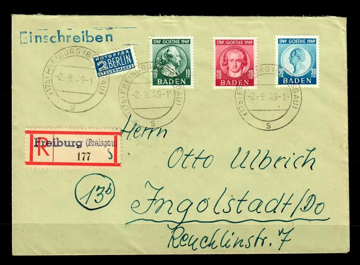 Baden: Einschreiben Freiburg 1949, MiNr. 47-49 nach Ingolstadt