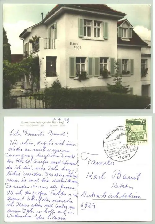Artikelbeschreibung u. Zustand : Siehe Scan. Weitere Infos : Ansichtskarte. Schwesternerholungsheim Haus Vogt. PLZ-Bereich pauschal 79410. Postalisch gelaufen 1969
