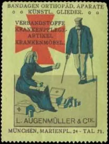 orthopädische Aparate, künstliche Glieder, Verbandstoffe, Krankenpflegeartikel, Krankenmöbel, Größe/Zustand: 6x5 , guter Zustand, Original alte Reklamemarke die seinerzeit für die Werbung benutzt wurde