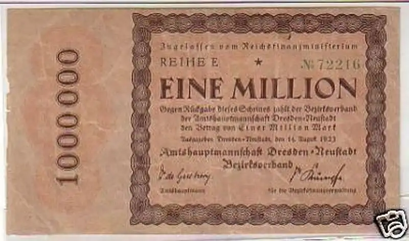 1 Million Mark 14.August 1923 Amtshauptmannschaft Dresden Neustadt, gebrauchte Erhaltung siehe Bild,