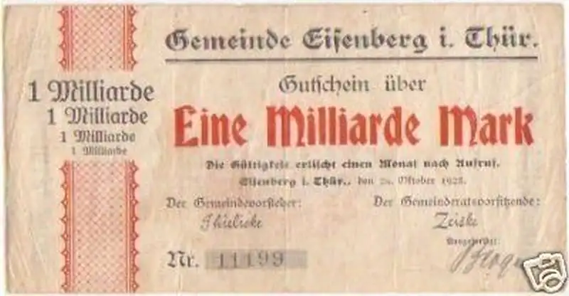 Banknote Inflation 1 Mrd. Mark Eisenberg 26.10.1923