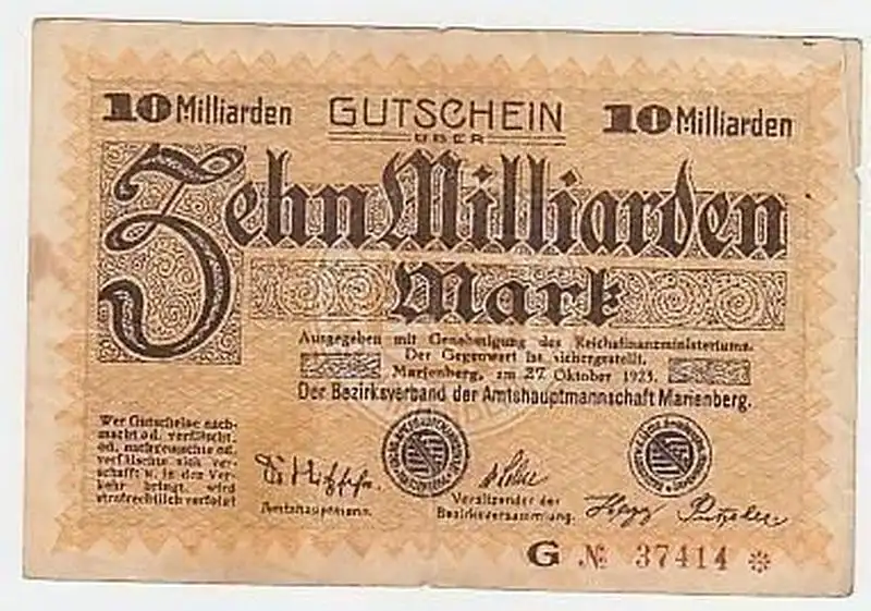 Banknote Inflation 10 Milliarden Mark Marienberg 1923