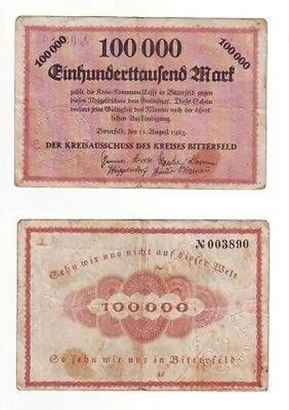 100000 Mark Banknote Bitterfeld 11.August 1923, gebrauchte Erhaltung siehe Bild,