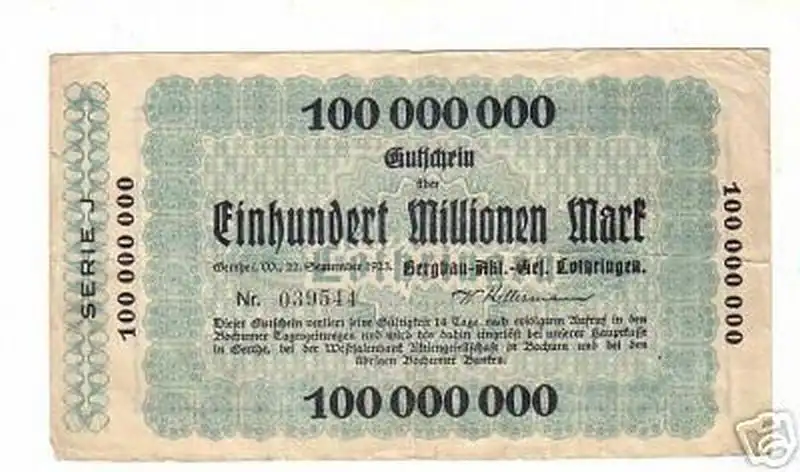Bergbau Aktien Gesellschaft Lothringen, 100 Millionen Mark 22.September 1923, gebrauchte Erhaltung siehe Bild,