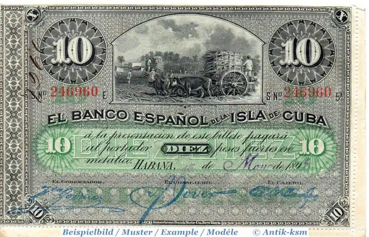 Banknote Kuba , 10 Pesos Schein in kfr. P.49.b ? , von 1896 , Banco Espanol de Cuba