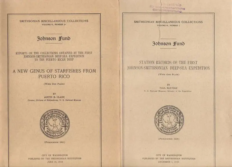 Titel: Station Records of the first Johnson-Smithsonian Deep-Sea Expedition. (Schriftenreihe: Smithsonian miscellaneous collections, Volume 91. Number 1. / Smithsonian Institution, Publication 3224). - Weitere 4 Titel beiliegend: 1. Isaac Ginsburg: Bollmania Litura, a new species of Goby. 1935, 3 Seiten, 1 Bildtafel. (Reports on the collections obtained by the first Johnson-Smithsonian Deep-Sea expedition to the Puerto Rican Deep. (Smithsonian miscellaneous collections, Volume 91. Number 20. / Smithsonian Institution, Publication 3299). - 2. Oskar Carlgren: A New Actinian. 1937, 4 Seiten, mit Abb.. - 3. Leonard P. Schultz: A new species of deep-sea fish, argyropelecus antrorsospinus, of the family sternoptichidae. 1937, 5 Seiten, mit Abb.. - 4. Austin H. Clark: A new genus of starfishes from Puerto Rico. 1938, 7 Seiten, 1 Bildtafel