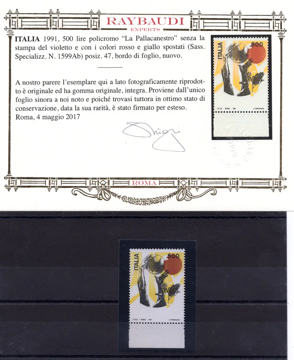 Gelber Basketball - Sorte RRRR Vollgummi - 1991 Gelber Basketball - Wunderschönes Exemplar unterer Blattrand ohne stark verschobenen lila und gelben Druck - Stammt aus dem einzigen bekannten Blatt von 50 vorhandenen - Sächsischer Katalog Spec. Nr. 1599 Ab Euro 6.000,00 - Sehr selten - Raybaudi Gold Zertifikat Cod. 609/WEB