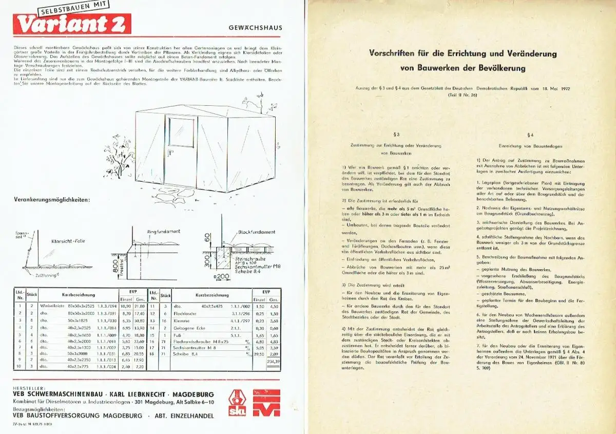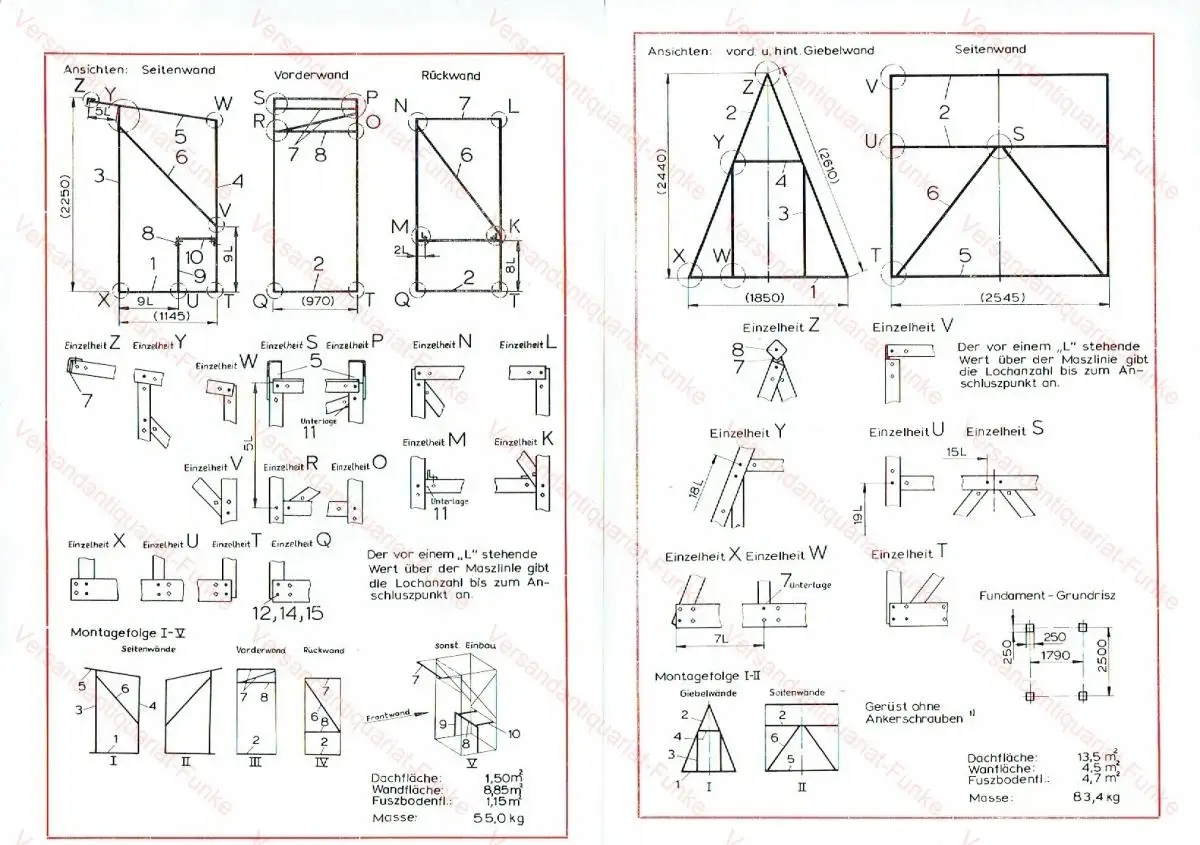 guter Zustand, geringe Gebrauchs- und Alterungsspuren: Umschlag gering abgenutzt - Prospekte an den überstehenden Kanten teils mit kleinen Blessuren - Prospekte teils etwas vergilbt, aber Seiten sauber und ordentlich, Sie erhalten folgendes: - Umschlag - quadratischer Prospekt von 1973 (12 Seiten mit einigen Bildern) - 10 Produktblätter von Regalen bis Gewächshaus und Vordächern + Deckblatt (= 22 Seiten mit zahlreichen Bildern und Aufmaßen) - 1 Blatt Vorschriften (2 Seiten) - 2 Blatt Preislisten (4 Seiten) - Standardblätter vom Januar 1972 (37 Blatt = 54 Seiten mit zahlreichen Bildern und Aufmaßen) Vollständigkeit kann mangels Inhaltsverzeichnisses nicht garantiert werden, die Reihe 113 der Standardblätter ist aber von Blatt 1 bis Blatt 28 komplett durchnummeriert, Papier, ca. 21 x 29,5-30,5, lose-Blatt-Sammlung (94 Seiten mit zahlreichen Bildern)