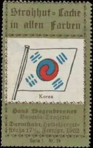 Flaggenserie: Korea, Strohhut & Lacke in allen Farben, Größe/Zustand: 7x4 , guter Zustand, Original alte Reklamemarke die seinerzeit für die Werbung benutzt wurde