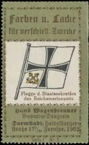 Flagge des Staatssekretärs des Reichsmarineamts, Farben und Lacke, Heidelbergerstraße 17, Größe/Zustand: 7x4 , leicht beschädigt, Original alte Reklamemarke die seinerzeit für die Werbung benutzt wurde