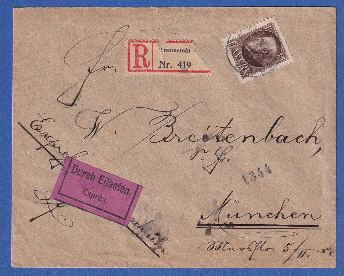 Bayern 1 Mark Ludwig III. Mi-Nr.104 II A auf Eil-R-Brief Traunstein n. München