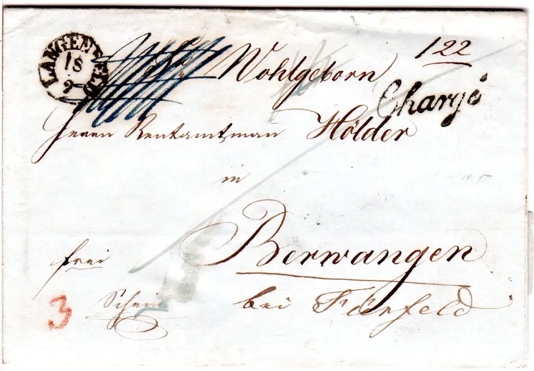 Faltbrief m. kpl. Inhalt v. Obersteinbach n. Berwangen bei Fürfeld. Schreibschrift-L1 Chargé und blaues Reko-Gitter. Franko Brief m. rücks. Notierung 6/6. Interessanter Brief in guter Erhaltung u. Präsentation!