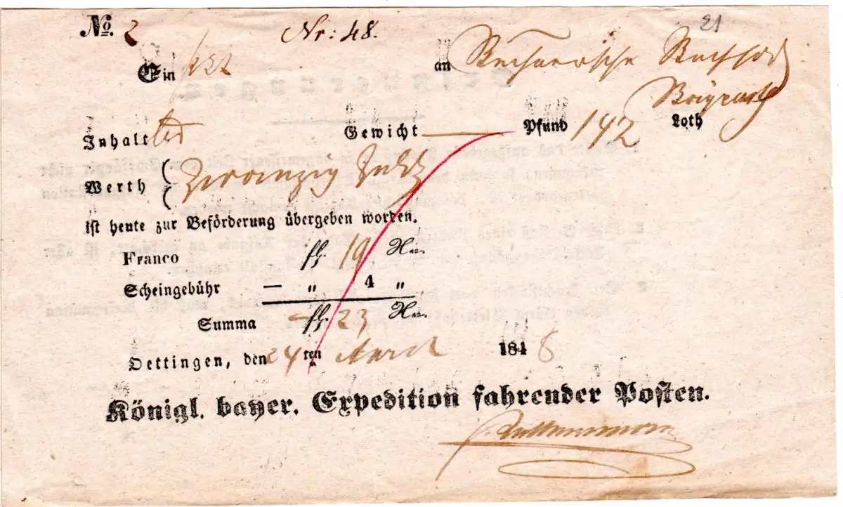 Bayern 1848, Postschein v. Öttingen f. eine Wertsendung