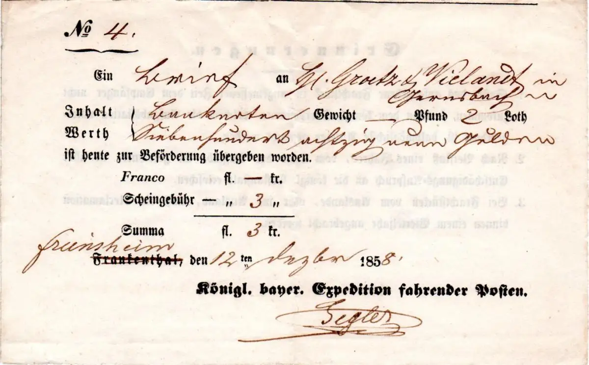 Bayern 1858, m. Freinsheim überschriebener Frankenthal Postschein f. Wertbrief