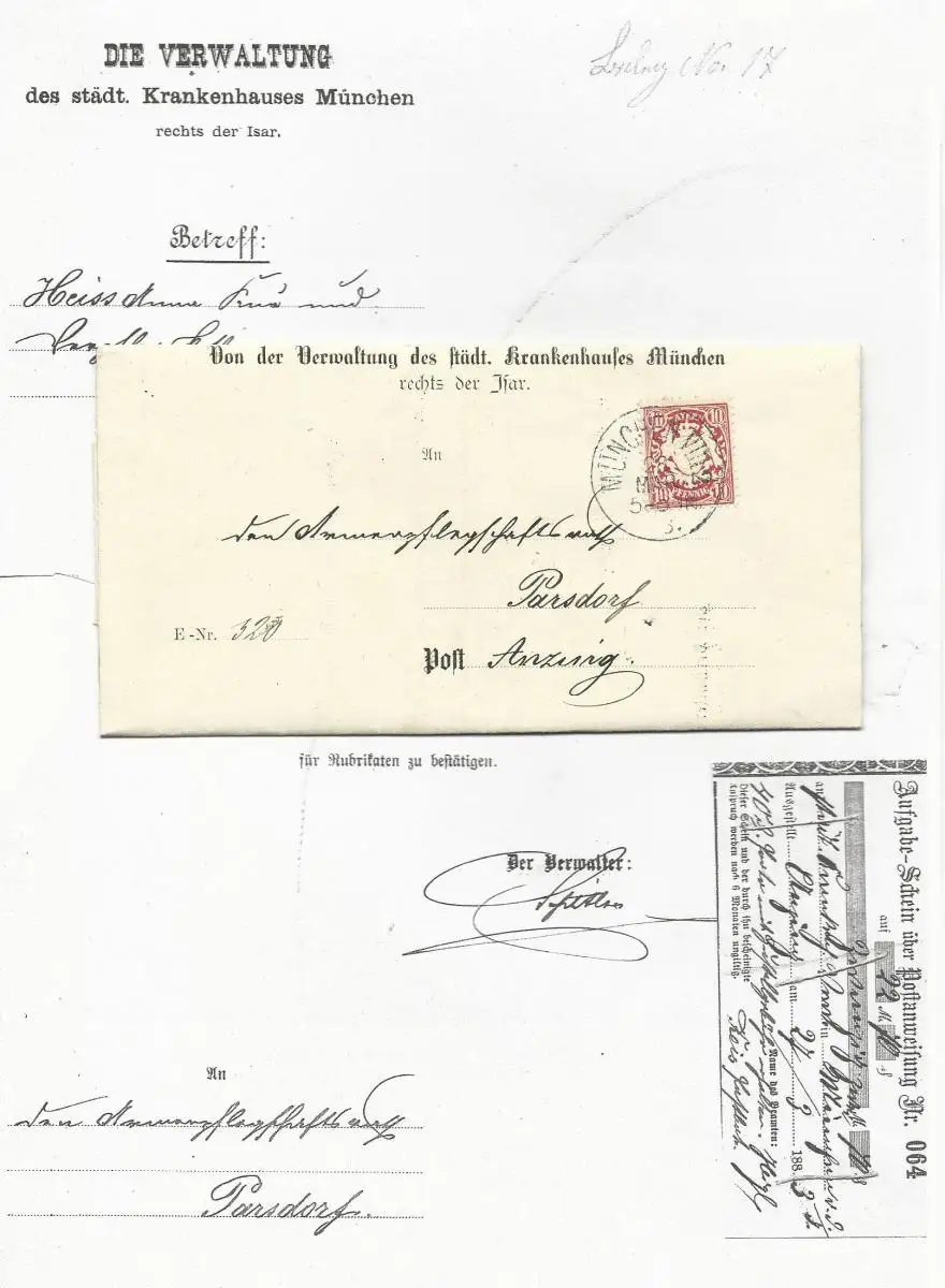 Bayern 1883, Brief m. 10 Pf. v. München VIII2 m. innen angeh. Postschein Anzing
