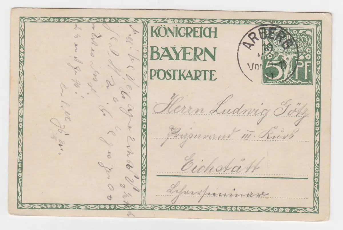 Bayern 1911, K1 ARBERG klar auf 5 Pf. Ganzsache.