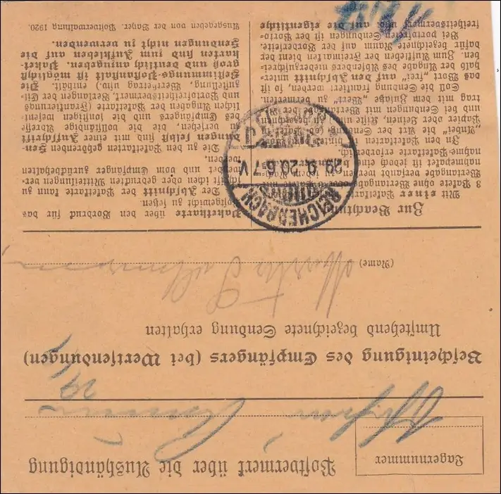 Bayern: 1920 Paketkarte Tirschenreuth mit Posthilfsstelle: Seltener Stempel