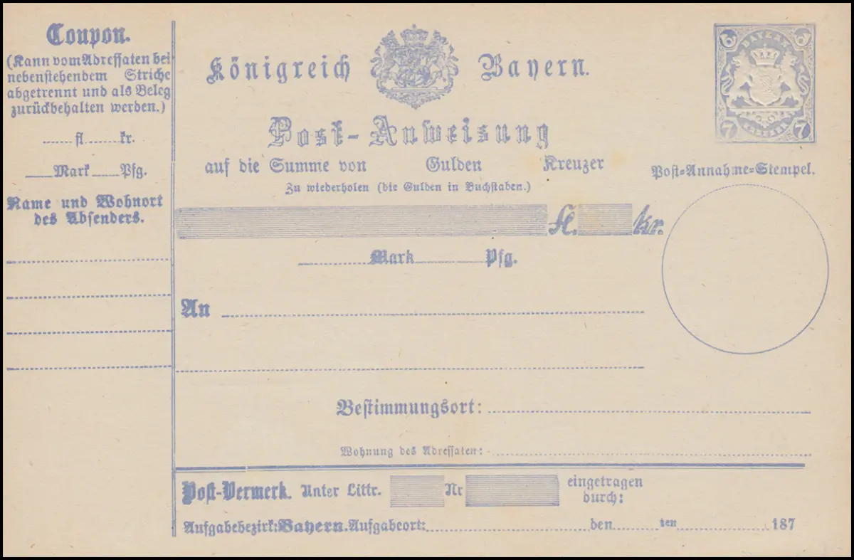 Bayern A 12 Type II Postanweisung 7 Kreuzer blau Wappen postfrische ** Erhaltung