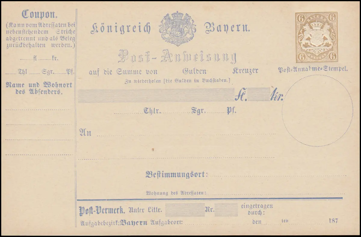 Bayern A 6 III Postanweisung 6 Kreuzer braun Wappen, Type III, ** postfrisch