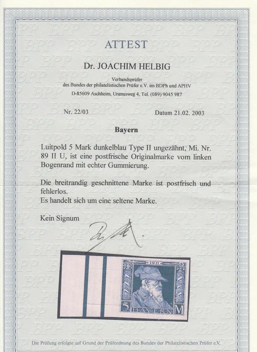 Bayern: MiNr. 89 II U, postfrisch, vom linken Bogenrand, BPP Attest