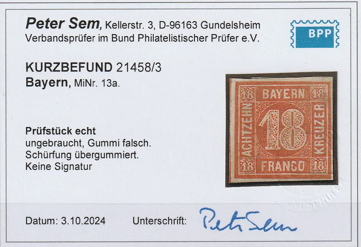 Bayern Nr. 13a (18 Kreuzer) ungebraucht. Befund Sem