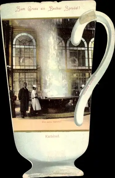 Becher Passepartout Ak Karlovy Vary Karlsbad Stadt, Der neue Sprudel
