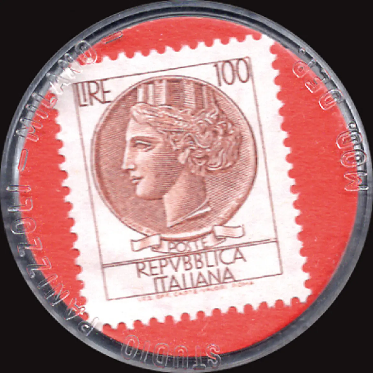 A - Bedarfsmarke - Syrakus Lire 100 in Plastikkapsel (Mod. hinterlegt Studio Panizzoli) mit Werbung Registri Buffetti - Neapel - sehr guter Erhaltungszustand - Selten Cod.439/182