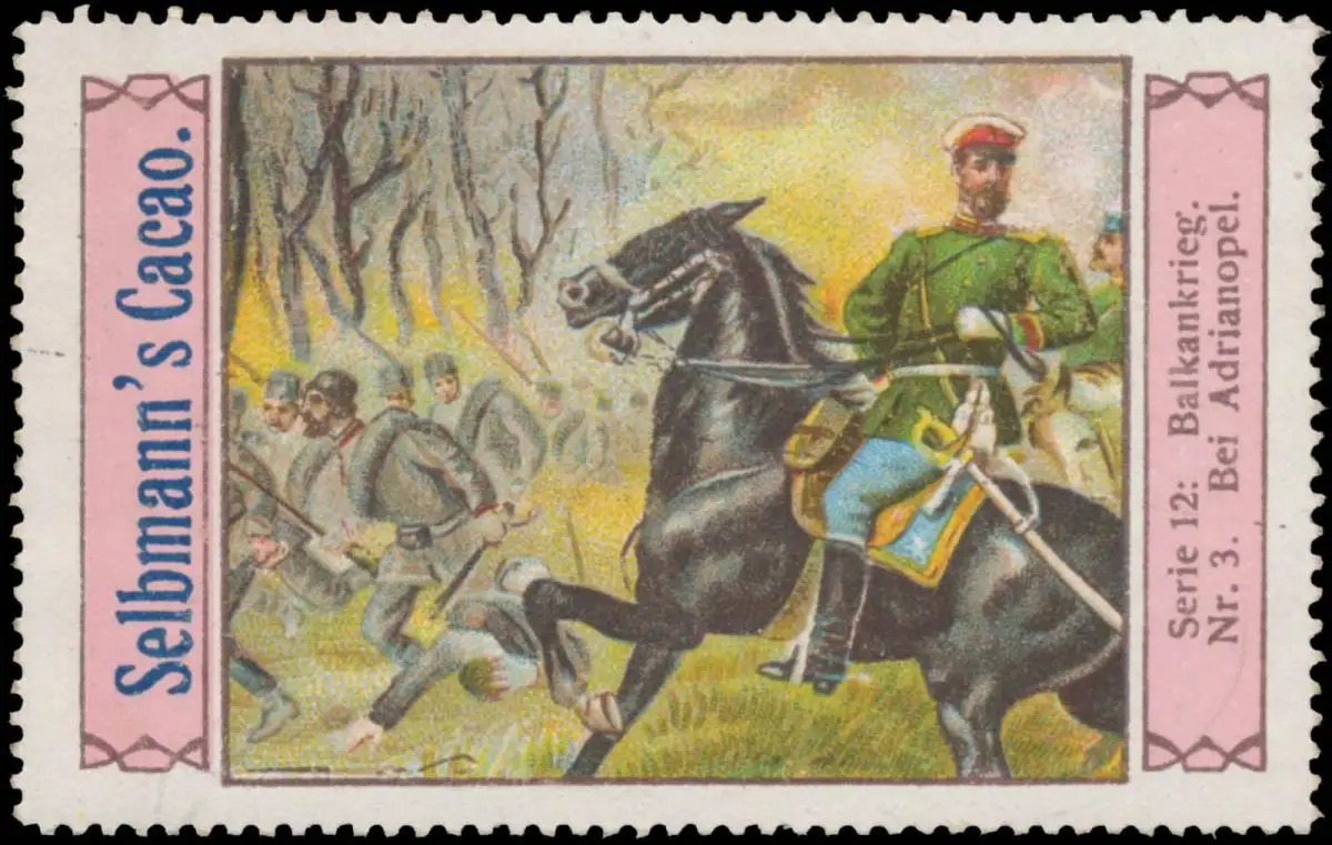 Selbmanns Cacao, Kakao, Serie 12 Balkankrieg, Nr. 3, Größe/Zustand: 7x5 , guter Zustand, Original alte Reklamemarke die seinerzeit für die Werbung benutzt wurde