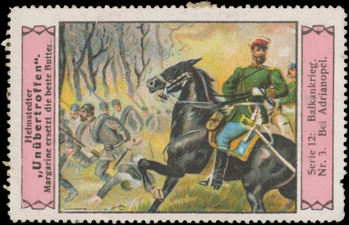 Serie 12: Balkankrieg, Nr. 3, Helmstedter "Unübertroffen" Margarine ersetzt die beste Butter, Größe/Zustand: 5x7 , beschädigt, Original alte Reklamemarke die seinerzeit für die Werbung benutzt wurde