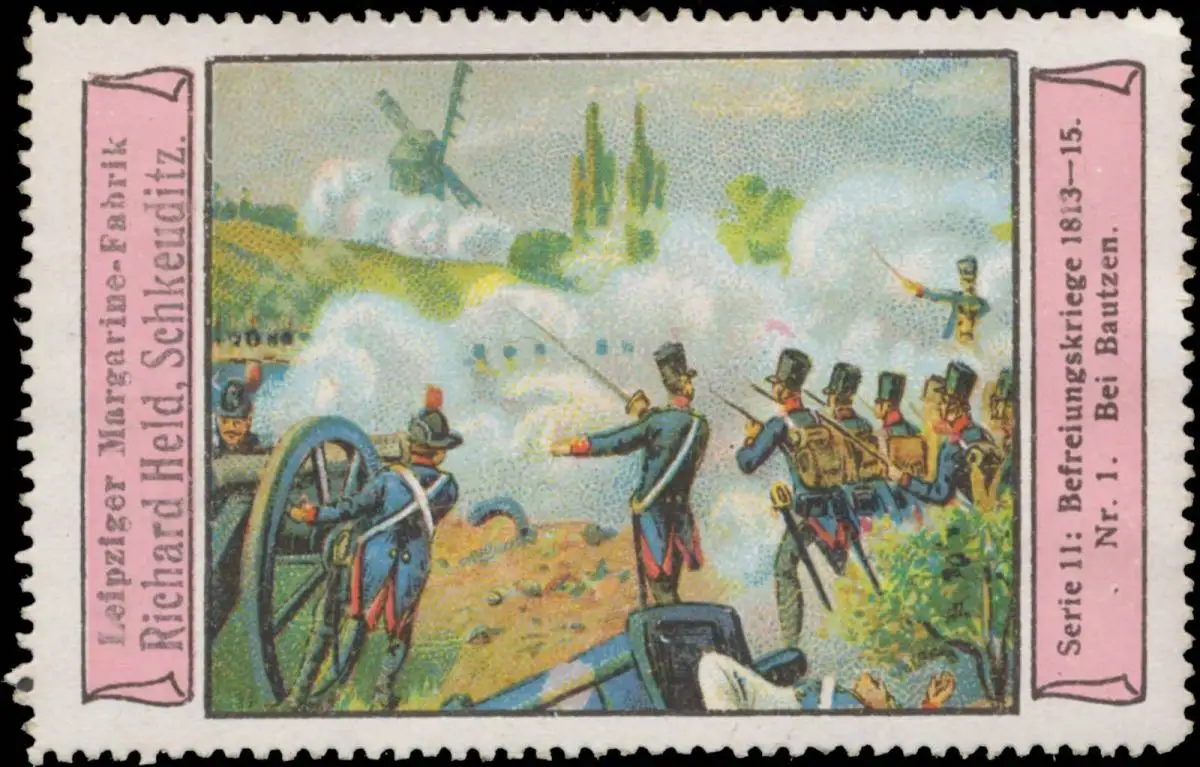 Serie 11, Nr. 1, Befreiungskriege 1813-15, Völkerschlacht, Napoleon, Leipziger Margarine-Fabrik, Größe/Zustand: 5x7 , guter Zustand, Original alte Reklamemarke die seinerzeit für die Werbung benutzt wurde