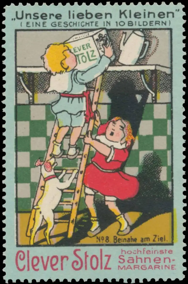 Unsere lieben Kleinen Kinder, eine Geschichte in 10 Bildern, No. 8, Clever Stolz hochfeinste Sahnen - Margarine, Hund, Größe/Zustand: 6x4 , guter Zustand, Original alte Reklamemarke die seinerzeit für die Werbung benutzt wurde