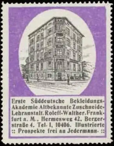 Erste Süddeutsche Bekleidungs-Akademie. Altbekannte Zuschneiderei-Lehr-Anstalt, Größe/Zustand: 6x4 , guter Zustand, Original alte Reklamemarke die seinerzeit für die Werbung benutzt wurde
